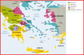 - El grupo dorio: dialectos de Corinto, Megara, Laconia, Mesenia, Sicilia, etc.